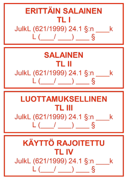 Salassapito- ja luokitusmerkinnöistä säädetään viranomaisten toiminnan julkisuudesta annetun lain 6 luvun 25 §:ssä (23.6.2005/495) seuraavaa, ”Viranomaisen asiakirjaan, jonka viranomainen antaa asianosaiselle ja joka on salassa pidettävä toisen tai yleisen edun vuoksi, on tehtävä merkintä sen salassa pitämisestä.Asianosaiselle on annettava tieto hänen salassapitovelvollisuudestaan myös silloin, kun salassa pidettäviä tietoja annetaan suullisesti.”Lain julkisen hallinnon tiedonhallinnasta (906/2019) 4:n luvun 18 § mukaan viranomaisen asiakirjat on luokiteltava ja niihin on tehtävä turvallisuusluokkaa koskeva merkintä sen osoittamiseksi, minkälaisia tietoturvallisuustoimenpiteitä asiakirjaa käsiteltäessä noudatetaan.Turvallisuusluokkaa koskeva merkintä on tehtävä, jos asiakirja tai siihen sisältyvä tieto on salassa pidettävä viranomaisten toiminnan julkisuudesta annetun lain 24 §:n 1 momentin 2, 5 tai 7–11 kohdan perusteella ja asiakirjaan sisältyvän tiedon oikeudeton paljastuminen tai oikeudeton käyttö voi aiheuttaa vahinkoa maanpuolustukselle, poikkeusoloihin varautumiselle, kansainvälisille suhteille, rikosten torjunnalle, yleiselle turvallisuudelle tai valtion- ja kansantalouden toimivuudelle taikka muulla niihin rinnastettavalla tavalla Suomen turvallisuudelle.Turvallisuusluokkaa koskevaa merkintää ei saa käyttää muissa kuin 1 momentissa tarkoitetuissa tapauksissa, ellei merkinnän tekeminen ole tarpeen kansainvälisen tietoturvallisuusvelvoitteen toteuttamiseksi tai asiakirja muutoin liity kansainväliseen yhteistyöhön. Kansainvälisistä tietoturvallisuusvelvoitteista annetussa laissa (588/2004) tarkoitettuihin asiakirjoihin on tehtävä turvallisuusluokituksesta merkintä siten kuin mainitussa laissa säädetään.Turvallisuusluokittelusta, turvallisuusluokiteltaviin asiakirjoihin tehtävistä merkinnöistä ja turvallisuusluokiteltujen asiakirjojen käsittelyyn liittyvistä tietoturvallisuustoimenpiteistä säädetään tarkemmin valtioneuvoston asetuksella. Asiakirjoihin tehtävistä salassapitoa koskevista merkinnöistä säädetään viranomaisten toiminnan julkisuudesta annetun lain 25 §:ssä.Merkintä voidaan tehdä muihinkin kuin 1 momentissa tarkoitettuihin asiakirjoihin. Salassapitomerkintä tehdään merkitsemällä asiakirjaan "SALASSA PIDETTÄVÄ" ja ruotsiksi "SEKRETESSBELAGD". Merkinnästä tulee käydä ilmi, miltä osin asiakirja on salassa pidettävä ja mihin salassapito perustuu. Jos salassapito perustuu säännökseen, jossa on vahinkoedellytyslauseke, merkintä voidaan tehdä kuitenkin niin, että siitä ilmenee vain se säännös, johon salassapito perustuu.Asiakirjan tai siinä olevien tietojen salassapidon perusteiden lakattua, merkinnän poistamisesta tai muuttamisesta on tehtävä merkintä asiakirjaan, johon alkuperäinen merkintä on tehty. Merkinnän asianmukaisuus on tarkistettava viimeistään asiakirjaa ulkopuoliselle annettaessa. (9.8.2019/907)Turvallisuusluokka merkitään ruotsiksi asiakirjoihin, jotka on laadittu ruotsinkielisinä tai käännetty ruotsiksi. Merkintä voidaan tehdä muulloinkin, jos sitä pidetään tarpeellisena.Erittäin salainen = ”YTTERST HEMLIG”Salainen = ”HEMLIG”Luottamuksellinen = ”KONFIDENTIELL”Käyttö rajoitettu = ”BEGRÄNSAD TILLGÅNG”Muuhun kuin salassa pidettävään asiakirjaan tehtävät merkinnätLain viranomaistoiminnan julkisuudesta (21.5.1999/62) 14 luvun 16 a §:n (9.8.2019/907) mukaan muuhun kuin salassa pidettävään asiakirjaan voidaan tehdä merkintä "HARKINNANVARAISESTI ANNETTAVA" ja ruotsiksi "UPPGES ENLIGT PRÖVNING", jos asiakirjan luovuttaminen on lain mukaan viranomaisen harkinnassa tai asiakirjaan sisältyviä tietoja saa lain mukaan käyttää tai luovuttaa vain määrättyyn tarkoitukseen.