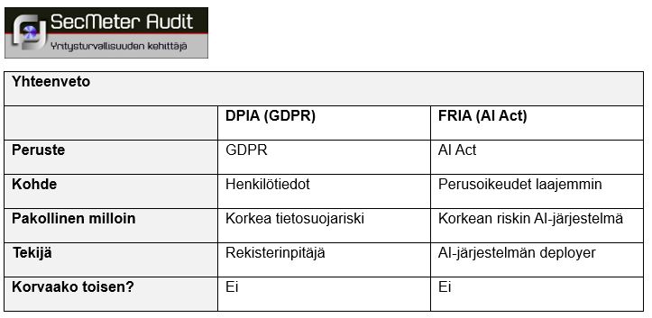 DPIA ja FRIA ovat siten oikeudellisesti itsenäisiä mutta toisiaan täydentäviä vaikutustenarviointeja. Ne eivät lähtökohtaisesti korvaa toisiaan, ja niiden soveltuminen määräytyy erikseen GDPR:n riskiperusteisen kynnysarvioinnin ja AI Actin mukaisen riskiluokittelun perusteella.