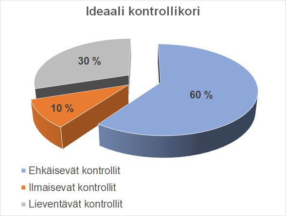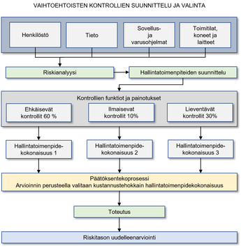 Kontrollien yleiset suunnitteluperiaatteetHallintatoimenpiteiden toteutuksessa on huomioitava Suomen lainsäädäntö, viranomaismääräykset sekä hyvä tiedonkäsittelytapa. Toimenpiteet tulee suunnitella siten, että ne eivät loukkaa työntekijöiden tai asiakkaiden yksityisyyden suojaa ja ovat sopusoinnussa organisaation sisäisten linjausten ja ohjeistusten kanssa.Suunnittelumallina ideaali kontrollikoriIdeaali kontrollikori on hallintatoimenpiteiden suunnittelumalli, joka perustuu kolmeen turvallisuusfunktioon. Näihin liittyy joukko turvallisuustoimenpiteitä, joiden painotusta ohjaavat kustannustehokkuus ja riskiperusteinen arviointi. Mallin tarkoituksena ei ole saavuttaa täydellistä lopputulosta, vaan ohjata toimenpiteitä kohti optimaalista turvallisuustasoa.Turvallisuusfunktiot ja niiden ideaalipainotus