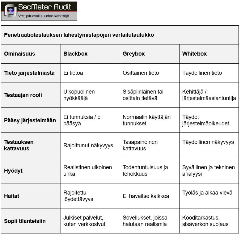 Penetraatiotestauksessa on kolme erilaista lähestymistapaa: Blackbox-, Greybox- ja Whitebox-testaus. Nämä vaihtoehdot eroavat toisistaan sen mukaan, kuinka paljon tietoa testaajalla on etukäteen testattavasta järjestelmästä tai kohteesta.