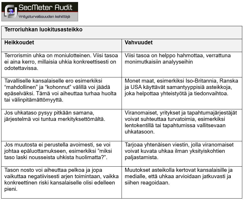 HyödytAsteikon keskeisin etu on sen yksinkertaisuus. Viisi porrasta muodostavat selkeän ja helposti ymmärrettävän tavan kuvata monimutkaista tilannearviota. Se antaa viranomaisille ja tapahtumajärjestäjille mahdollisuuden suhteuttaa turvatoimiaan uhkatason mukaan.Asteikko on kansainvälisesti vertailukelpoinen, mikä helpottaa yhteistyötä muiden maiden turvallisuusviranomaisten kanssa. Kansalaisille se tarjoaa yleiskuvan siitä, kuinka todennäköisenä viranomaiset pitävät terrori-iskua Suomessa.RajoitteetTerrorismin uhka-asteikko yksinkertaistaa terrorismin uhkaa liikaa. Se ei kerro, minkälaisesta uhasta on kyse tai mikä toimija sen taustalla on. Kansalaisille voi jäädä epäselväksi, mitä eroa on esimerkiksi “merkittävällä” ja “korkealla” uhalla, tai mitä heidän tulisi konkreettisesti tehdä tai huomioida eri uhkatasoilla.Asteikko mittaa vain terrorismia, ei muita vakavia turvallisuusuhkia. Tämä voi vääristää kansalaisten käsitystä turvallisuuden kokonaistilanteesta, sillä Suomen suurimmat uhat liittyvät tällä hetkellä valtiollisiin toimijoihin, erityisesti Venäjän harjoittamaan valtioterrorismiin, kuten salamurhiin ja sabotaaseihin sekä hybridivaikuttamiseen ja tiedusteluun.Yksittäisten tekijöiden ennakoimattomuuden ongelmaSuurin osa viime vuosien terroriteoista Euroopassa on ollut yksittäisten toimijoiden toteuttamia. Tällaisen “yksinäisen suden” radikalisoitumista on lähes mahdotonta ennustaa, eikä se aina näy viranomaisten tiedustelutiedoissa.Tämä tarkoittaa, että terroriteko voi toteutua yhtä hyvin esimerkiksi tasoilla ”matala” ja ”kohonnut”. Asteikko ei siis koskaan voi toimia varmana mittarina sille, onko isku mahdollinen. Se kertoo ainoastaan yleisestä todennäköisyydestä, ei yksittäisistä riskeistä. Tämä rajoittaa sen käytettävyyttä erityisesti kansalaisille suunnattuna turvatiedon lähteenä.Miksi terroriteko voi toteutua missä tahansa luokassa?