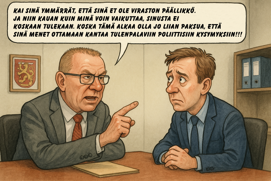 Seppo Nevala: "Kai sinä ymmärrät, että sinä et ole viraston päällikkö. Ja niin kauan kuin minä voin vaikuttaa, sinusta ei koskaan tulekaan. Koska tämä alkaa olla jo liian paksua, että sinä menet ottamaan kantaa tulenpalaviin poliittisiin kysymyksiin."Paavo Selin: "Enhän mä poliittisiin kysymyksiin..."Seppo Nevala: "Olethan sinä ottanut, jos sinä olet tämmöisen mennyt möläyttämään. Jyrki Katainen on tämän tiedon välittänyt ja sinä et ole pystynyt sitä kumoamaan. Päinvastoin tämmöisiä selityksiä, minä en niitä halua kuulla."Paavo Selin: "Mä olen antanut vain asiallista tietoa eri viranomaisten roolista."Seppo Nevala: "Se on kuule parempi, että jätät tämän poliittisen puolen minun hoitoon, etkä laajenna toimialaasi. Vaikka sinulla on suuri julkisuuskipeys ja poliisiylijohtajan virka oli tavoitteena, niin minä en kuule kauaa enää katsele tämmöistä menoa."