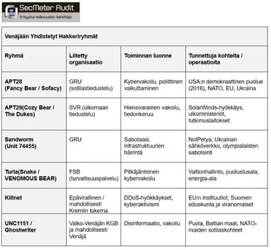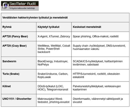 Valtiollinen ohjaus ja kyberstrategiaVenäjän kybertoiminta heijastaa maan laajempaa turvallisuusstrategiaa, jossa sotilaalliset, tiedustelulliset ja informaatio-operaatiot sulautuvat toisiinsa. Hakkeriryhmät toimivat usein valtion käsivarren jatkeena, toteuttaen tavoitteita, joita olisi perinteisin keinoin vaikea saavuttaa ilman poliittisia seuraamuksia.Monet ryhmistä ovat saaneet nimityksiä kansainväliseltä kyberturvayhteisöltä, mutta niiden juuret löytyvät usein Venäjän tiedustelupalveluista.APT28 (Fancy Bear) edustaa GRU:n hyökkäävää etulinjaaAPT28, tunnetaan myös nimillä Fancy Bear ja Sofacy, on yhdistetty suoraan Venäjän sotilastiedusteluun, GRU:hun. Ryhmän toiminta on aggressiivista ja sen kohteet poliittisesti strategisia.Vuoden 2016 Yhdysvaltain presidentinvaaleihin vaikuttanut sähköpostivuoto demokraattisesta puolueesta on yksi tunnetuimmista APT28:n operaatioista. Lisäksi ryhmä on hyökännyt NATO:n, EU:n ja useiden maiden hallintojen kimppuun. Sen toimintatapa on usein avoimesti häiritsevä ja provokatiivinen.APT29 (Cozy Bear) edustaa SVR:n hienovaraista vakoilijaaAPT29, eli Cozy Bear, toimii erilaista taktiikkaa käyttäen. Ryhmä on yhdistetty Venäjän ulkomaantiedustelupalveluun (SVR), ja sen operaatioille on ominaista hienostuneisuus ja pitkäjänteisyys.Yksi tunnetuimmista hyökkäyksistä on SolarWinds-tapaus, jossa useiden Yhdysvaltain virastojen tietojärjestelmät vaarannettiin. Cozy Bear keskittyy enemmän salassa tapahtuvaan vakoiluun kuin avoimeen sabotaasiin.Sandworm edustaa sabotoinnin erikoisyksikköäSandworm, jota kutsutaan myös nimellä Unit 74455, toimii GRU:n alaisuudessa ja tunnetaan kyberiskujen sabotoivasta luonteesta. Ryhmä on ollut vastuussa esimerkiksi Ukrainan sähköverkon kaatamisesta vuosina 2015 ja 2016 sekä NotPetya-haittaohjelman levittämisestä, joka aiheutti miljardiluokan vahingot globaalisti. Sandwormin toiminta osoittaa, miten kyberaseet voivat aiheuttaa todellista infrastruktuurista tuhoa.Turla edustaa pitkäjänteistä vakoilijaaTurla, tunnetaan myös nimillä Snake tai VENOMOUS BEAR, on liitetty Venäjän turvallisuuspalvelu FSB:hen. Sen operaatioille on ominaista huomaamattomuus ja tekninen kehittyneisyys. Turla on vakoillut erityisesti valtionhallinnon organisaatioita, puolustusalaa ja energia-alan yrityksiä. Ryhmän työkalut ovat usein monimutkaisia ja vaikeasti jäljitettäviä, mikä viittaa valtiolliseen taustatukeen.KillNet edustaa epävirallista kyberaktivismiaKillNet on venäläistaustainen hakkeriryhmä, joka tunnetaan erityisesti palvelunestohyökkäyksistään (DDoS) länsimaisia valtion virastoja, yrityksiä ja infrastruktuuria vastaan. Ryhmä perustettiin arviolta alkuvuonna 2022 ja nousi laajaan julkisuuteen Venäjän hyökättyä Ukrainaan helmikuussa 2022.KillNet eroaa monista muista kyberuhkatoimijoista siinä, että sen jäsenet esiintyvät enemmän “kansalaisaktivisteina” kuin tiedustelun ammattilaisina. Ryhmä on tehnyt useita DDoS-hyökkäyksiä länsimaisia instituutioita vastaan, mukaan lukien Suomen eduskunta ja viranomaiset.Vaikka KillNet ei virallisesti kuulu Venäjän hallintoon, sen toiminta on johdonmukaisesti Kremlin narratiiveja tukevaa ja palvelee usein valtiollisia intressejä.Ryhmän kohteisiin ovat kuuluneet EU-maiden ja Naton jäsenvaltioiden virastot, yritykset, terveydenhuolto, logistiikka, pankit ja kriittinen infrastruktuuri. KillNet ilmoittaa toimivansa pro-Venäjä ja anti-NATO -linjalla, usein kostona Venäjään kohdistuvista toimista tai kyberhyökkäyksistä.Toimintatavat